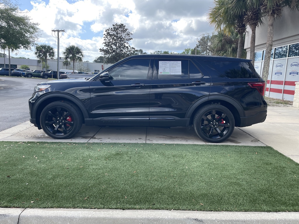 2022 Ford Explorer ST Black Metallic WINDOW TINT, 4WD, 110V/150W AC Power Outlet, 360-Degree Camera w/Split View, 3rd row seats: bench, 4-Wheel Disc Brakes, 4G LTE Wi-Fi Hotspot Removal Credit, ABS brakes, AM/FM radio: SiriusXM, Auto High-beam Headlights, Auto-Dimming Rearview Mirror (Interior), Automatic temperature control, Electronic Stability Control, Emergency communication system: SYNC 3 911 Assist, Evasive Steering Assist, Exterior Parking Camera Rear, Ford Co-Pilot360 Assist+, FordPass Connect, Four wheel independent suspension, Front Bucket Seats, Front dual zone A/C, Front fog lights, Front Parking Sensors, Front Rain-Sensing Wipers, Fully automatic headlights, Hands-Free Foot-Activated Liftgate, Hands-Free Liftgate Delete, Heated door mirrors, Heated front seats, Heated steering wheel, Illuminated entry, Intelligent Adaptive Cruise Control, Leather steering wheel, Low tire pressure warning, Memory Driver's Seat, Memory seat, Outside temperature display, Performance Front & Rear Brakes, Power door mirrors, Power driver seat, Power Liftgate, Power passenger seat, Power Tilt/Telescoping Steering Column, Power windows, Radio: B&O Sound System by Bang & Olufsen, Rear air conditioning, Remote keyless entry, Reverse Brake Assist, Second Row Heated Seats, Security system, SelectShift Capability w/Paddle Shifters, Sideview Mirrors w/Gloss Black Caps, Speed Sign Recognition, Split folding rear seat, Sport steering wheel, ST High Package, ST Street Pack, Steering wheel mounted audio controls, SYNC 3 Communications & Entertainment System, SYNC 3/Apple CarPlay/Android Auto, Third Row PowerFold (Folds Flat), Twin Panel Moonroof, Universal Garage Door Opener (UGDO), Ventilated front seats, Voice-Activated Touchscreen Navigation System, Wheels: 21" Aluminum, Wireless Charging Pad.